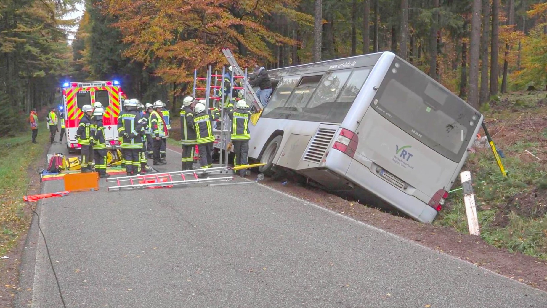 Da sich die Bustüren aufgrund der Schräglage nicht mehr öffnen ließen, mussten die Rettungskräfte schnell improvisieren. Mehrere Feuerwehren aus der Umgebung – unter anderem aus Mandern, Kell am See und Saarburg – rückten an und sicherten das Fahrzeug zunächst mit Stützen, um ein weiteres Abrutschen zu verhindern.