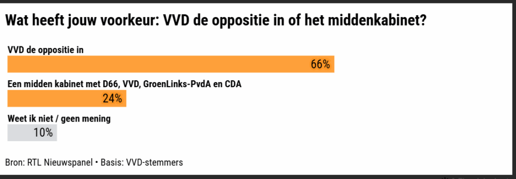 Maar VVD-stemmers zijn juist weer minder toeschietelijk geworden ten opzichte van zo’n middenkabinet. Zij vinden zo’n kabinet, waarin samengewerkt moet worden met GroenLinks-PvdA, nóg minder acceptabel dan vorige week donderdag, van 23 procent toen naar 18 procent nu.