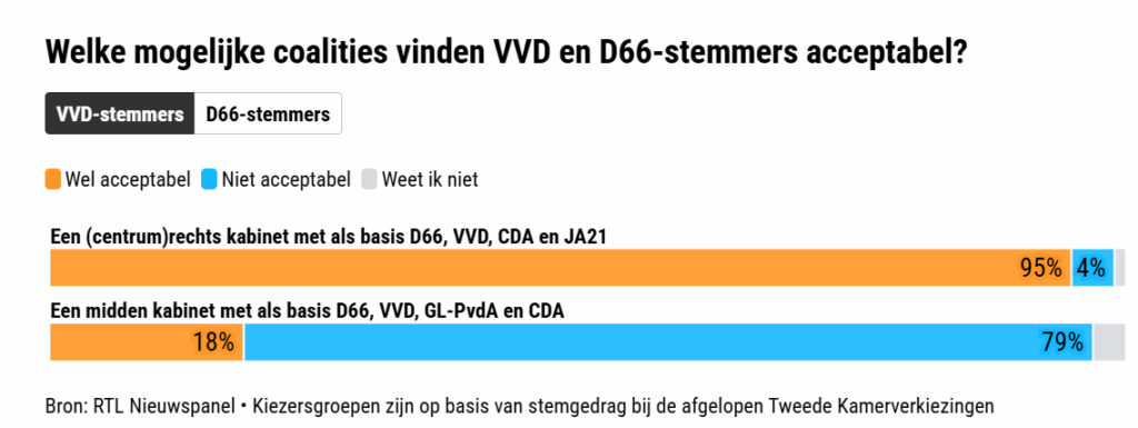 En de kiezers op beide partijen zijn stelliger geworden dan vlak na de verkiezingen. Zo vond een dag na de verkiezingen nog 56 procent van de D66-kiezers een centrumrechts kabinet acceptabel. Dat is een week later 36 procent. D66’ers hebben behoefte aan ‘stabiliteit’, willen geen ‘gekke constructies’ zoals minderheidskabinetten of gedoogsteun, en dus is er maar één optie, zeggen ze: een middenkabinet.