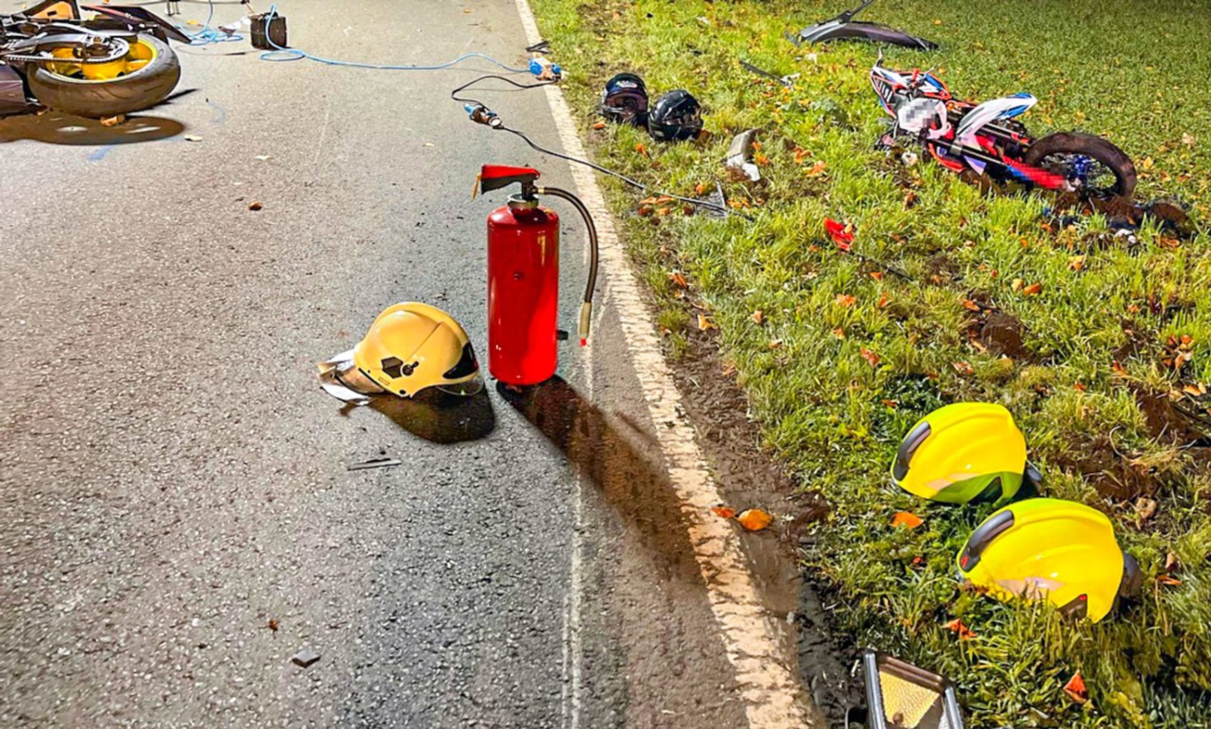 Für die alarmierten Rettungskräfte bot sich beim Eintreffen ein chaotisches Bild: Mehrere Fahrzeuge standen quer auf der Fahrbahn, Trümmerteile waren über Dutzende Meter verteilt, Motorräder lagen demoliert im Graben.