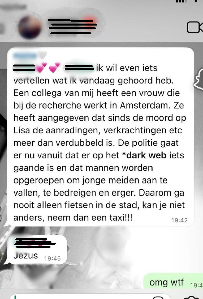 In het bericht staat dat de informatie afkomstig zou zijn van iemand die beweert dat zijn collega een vrouw heeft die bij de recherche in Amsterdam werkt. ‘Ze heeft aangegeven dat sinds de moord op Lisa de aanrandingen, verkrachtingen et cetera meer dan verdubbeld zijn’, luidt de tekst.