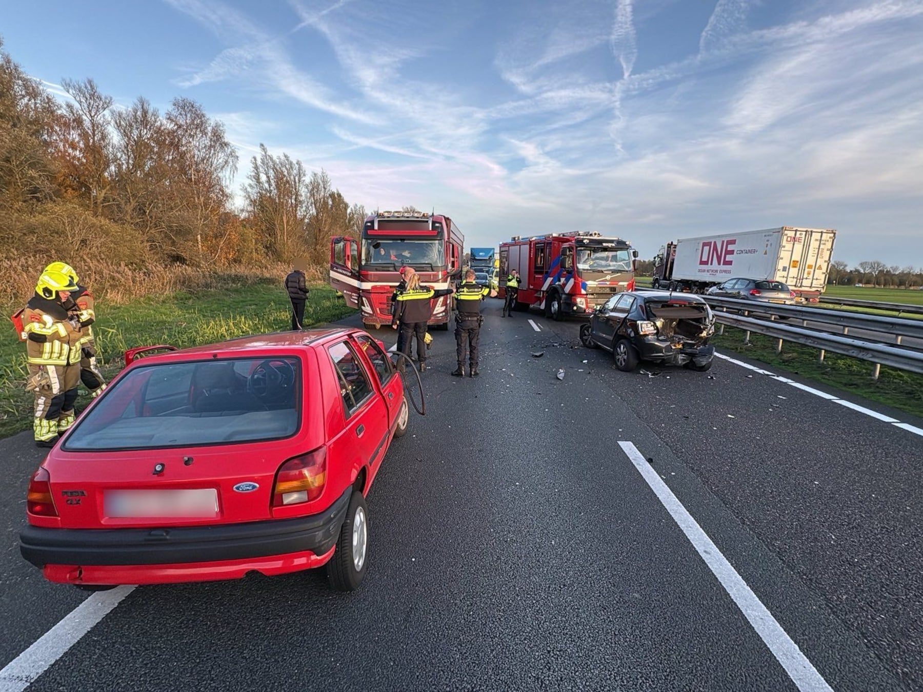 Nog geen kwartier later ging het opnieuw mis. Een auto met drie inzittenden naderde de afgesloten rijstroken, maar zag de rode kruizen en de brandweerwagen niet – of te laat. De auto klapte met aanzienlijke snelheid op de achterzijde van het brandweervoertuig.
