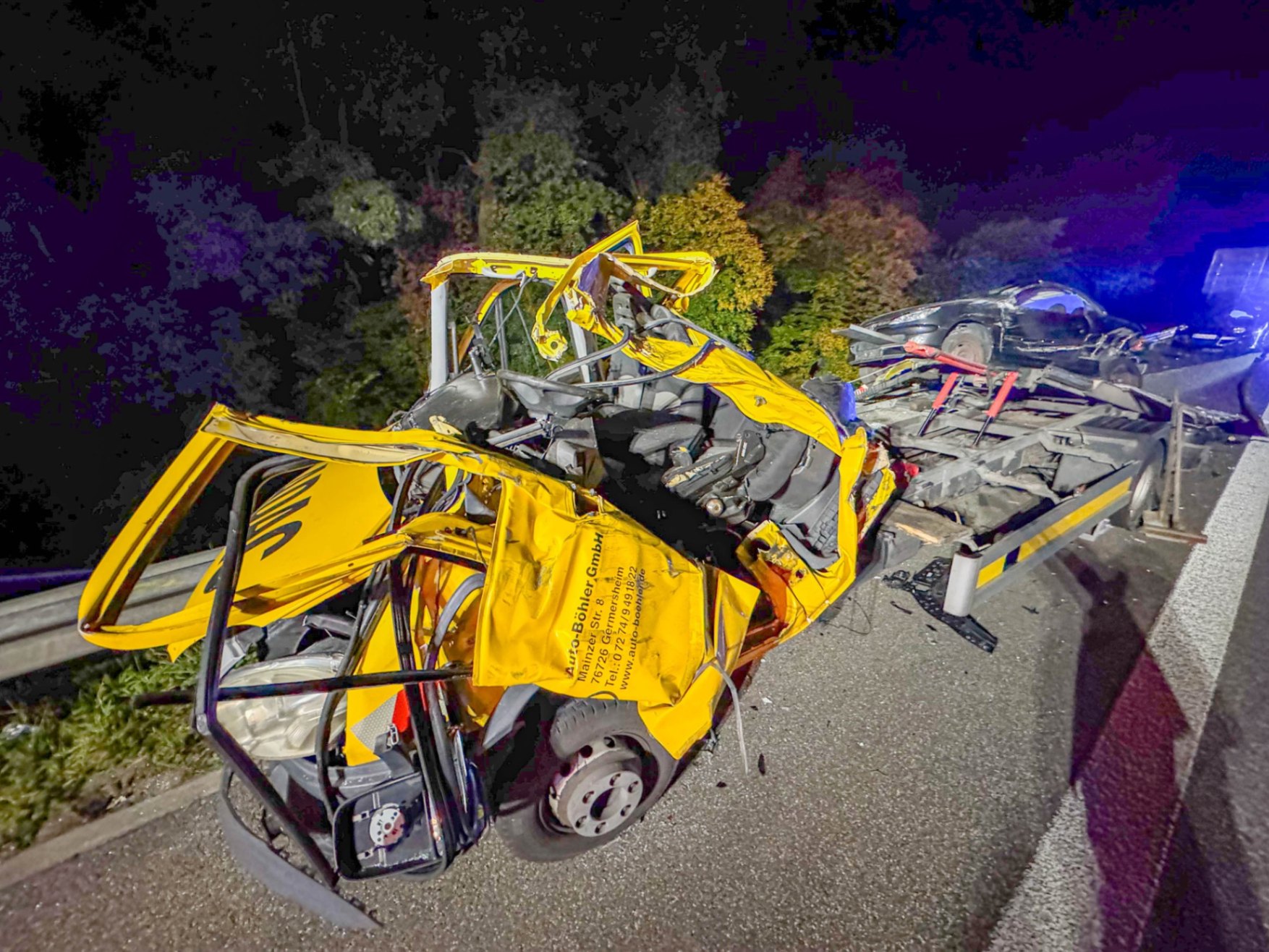 Was dann geschah, lässt selbst erfahrene Rettungskräfte erschaudern: Die Sattelzugmaschine schleuderte über das Plateau des Abschleppwagens, riss dessen Führerhaus vollständig ab, wurde in die Luft geschleudert und kam nach rund 50 Metern Flugstrecke auf der Seite liegend quer über die Fahrbahn zum Stillstand.