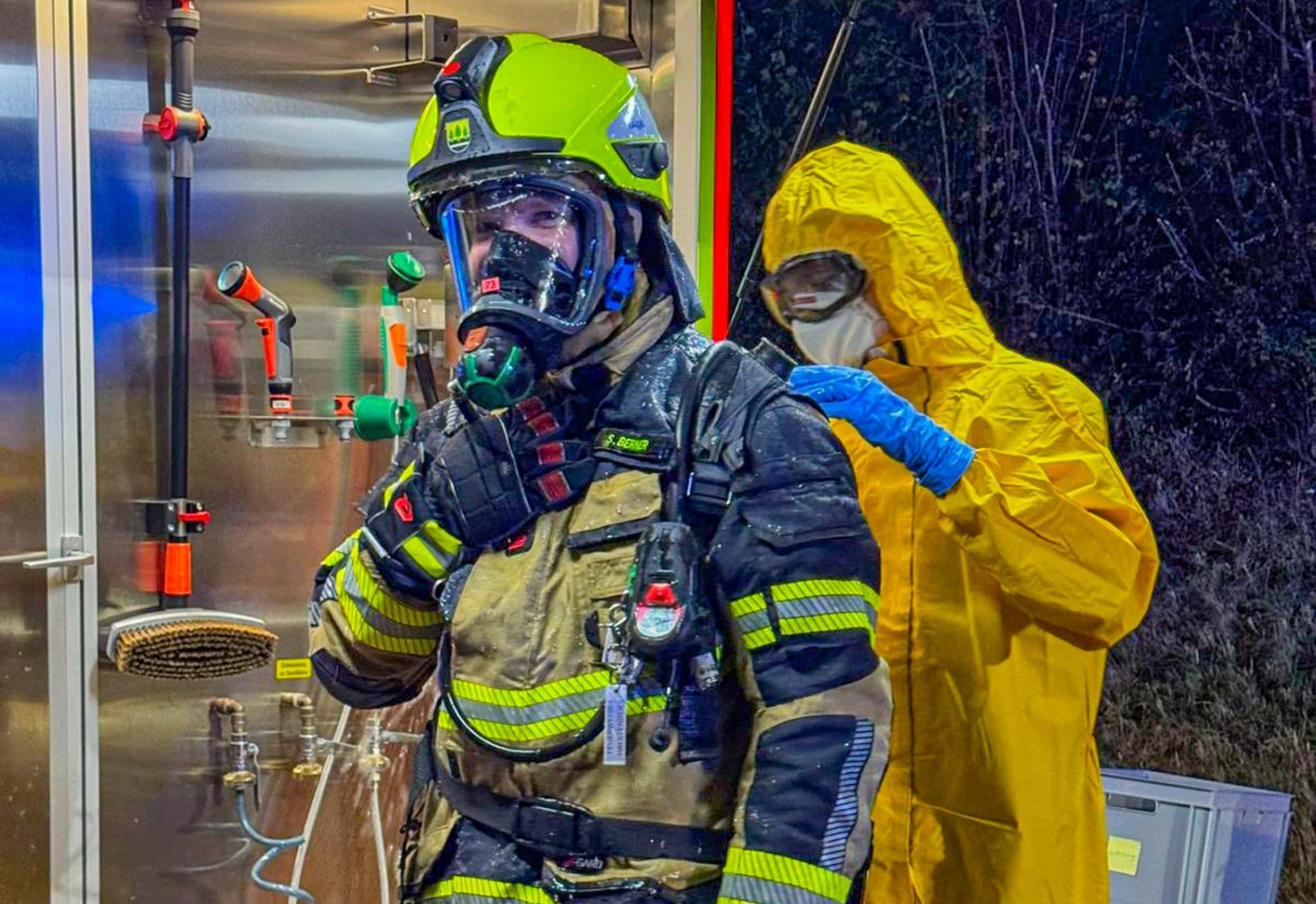 Kurz darauf traf die Feuerwehr Halstenbek mit mehreren Einsatzfahrzeugen an der Unfallstelle ein. Die EinsatzkrÀfte begannen zunÀchst, das Feuer mit Wasser zu bekÀmpfen, wechselten dann auf Schaum, um ein weiteres Aufflammen zu verhindern. Aufgrund der starken Rauchentwicklung und der giftigen DÀmpfe setzten die Feuerwehrleute AtemschutzgerÀte ein. Zwei Trupps, die unter Atemschutz arbeiteten, wurden nach dem Einsatz im AbrollbehÀlter Hygiene dekontaminiert und neu eingekleidet, um gesundheitliche Risiken zu minimieren.
