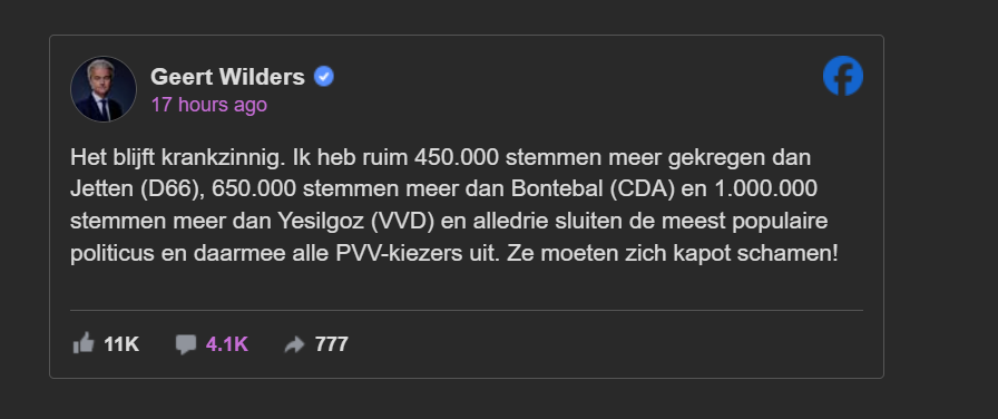 In een bericht op Facebook reageerde Wilders zichtbaar gefrustreerd op het feit dat D66, VVD en CDA hem buitensluiten bij de kabinetsformatie, ondanks dat hij veruit de meeste stemmen van alle politici heeft gekregen.